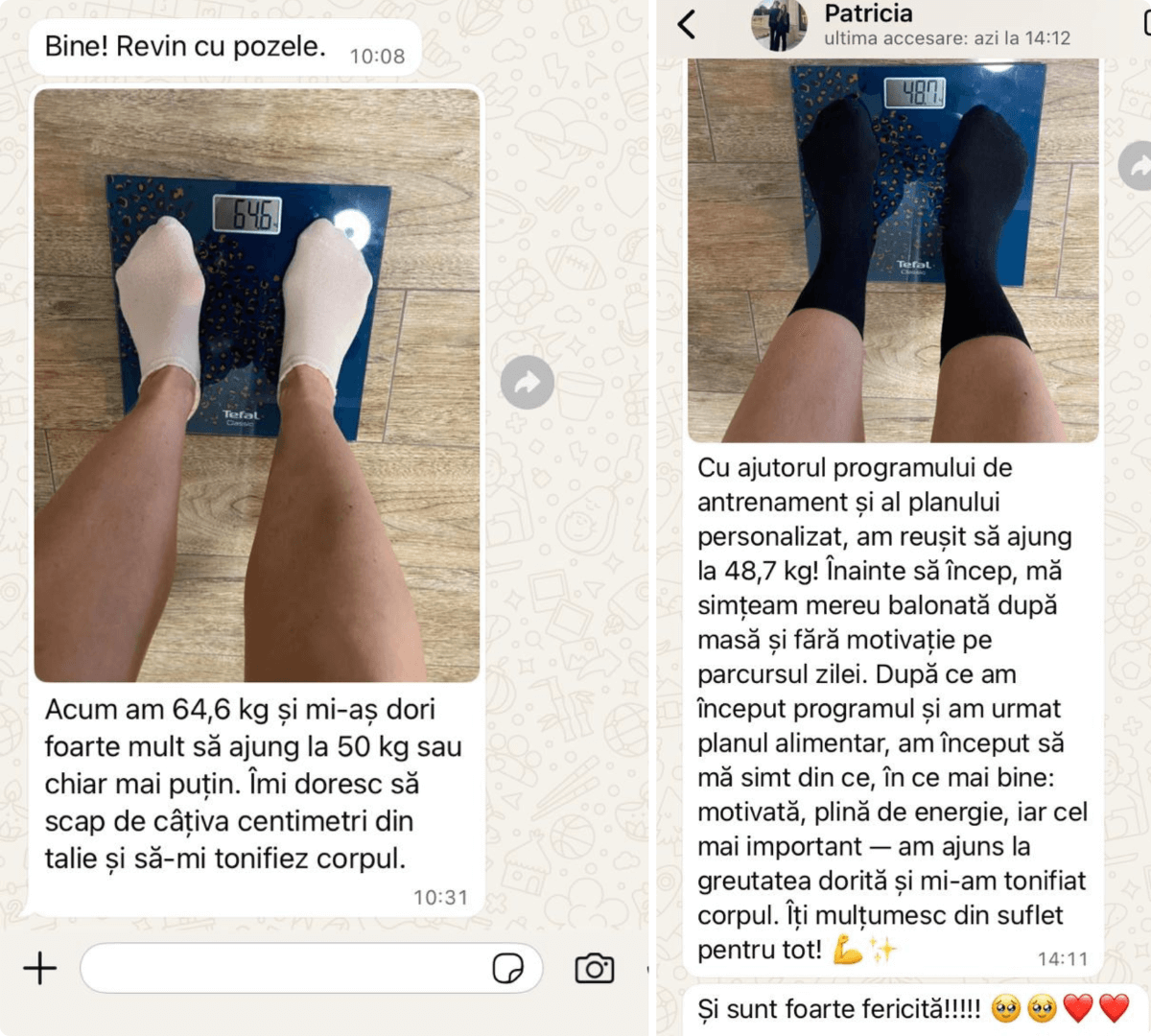 După ce am urmat sfaturile Ralucăi, mă simt energică și încrezătoare ca niciodată! Am reușit să ajung la greutatea dorită și să-mi tonifiezi corpul. Am mai multă stimă de sine, iar corpul meu este în cea mai bună formă de până acum. Mulțumesc!